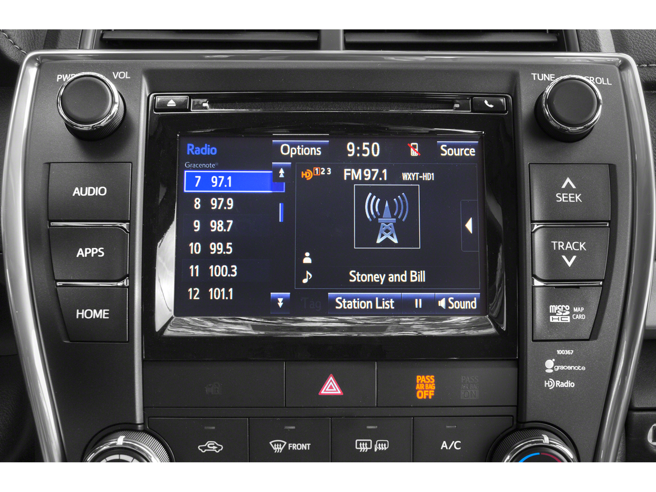 - Radio: Entune Premium Audio w/Navigation/App Suite -inc: Entune multimedia bundle, 7" high-resolution touch-screen display, AM/FM CD player, MP3/WMA playback capability, 6 speakers, auxiliary audio jack, USB 2.0 port w/iPod connectivity and control, advanced voice recognition, hands-free phone capability, phone book access and music streaming via Bluetooth® wireless technology, Entune app suite, HD Radio, HD predictive traffic and doppler weather overlay, AM/FM cache radio and SiriusXM radio w/90-day complimentary trial, Entune app suite includes Bing, Facebook Places, iHeartRadio, MovieTickets.com, Open Table, Pandora and Yelp, real-time info including traffic, weather, fuel prices, sports and stocks, Access to Entune services is free, See Toyota.com/entune for details